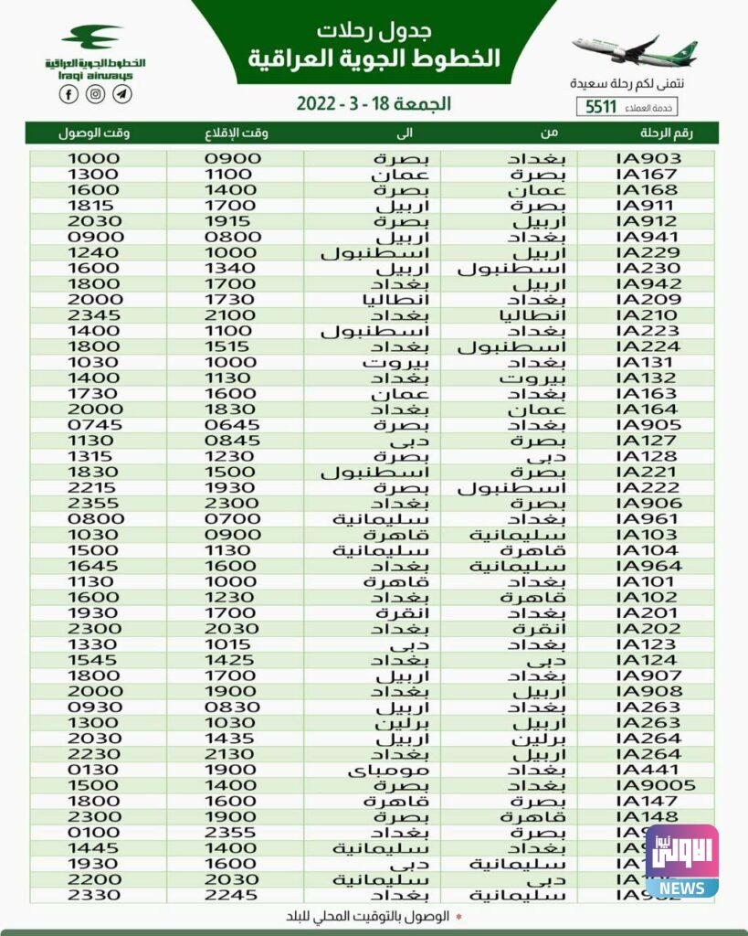 أعلنت الخطوط الجوية العراقية، اليوم الأربعاء، عن جدول رحلاتها ليوم غد الخميس.