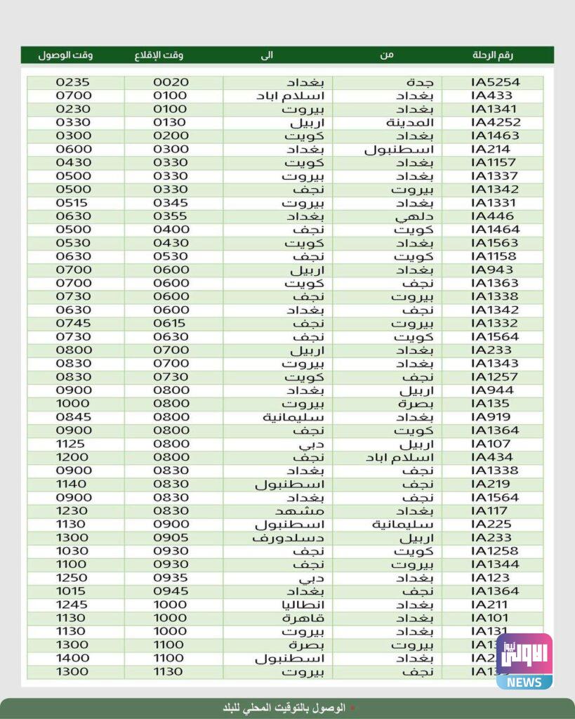 جدول رحلات شركة الخطوط الجوية العراقية ليوم الثلاثاء